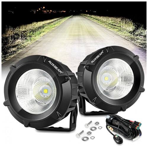 Padrão de feixe combinado e espalhado. A luz de condução redonda do Auxbeam de 50W apresenta um padrão de feixe combinado, com refletores Spot Spread perfeitamente angulados, para máxima distância à frente e iluminação periférica aprimorada ao longo das bordas da estrada