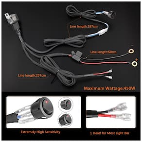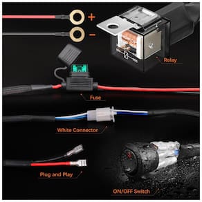 LARGOS USOS. Nosso chicote de fios de barra de luz LED tem 1 derivação com capacidade de carga de 200W, é universal para qualquer barra de luz de qualquer tamanho, luzes fora de estrada, luzes de trabalho LED e luzes de nevoeiro dentro de 200W. Compatível com todos os automóveis, barcos e dispositivos equipados com uma fonte de energia de 12V 30V. Até 2,5 metros de comprimento suficiente para usá lo onde quiser. PROJETO EXCLUSIVO. Os fios de cobre de fio flexível são enrolados pelo PVC de classificação AWM que isola até 105, a camada de nylon oca durável e altamente resistente à temperatura, protege a fiação contra desgaste e ruptura e melhor dissipação de calor. PROTEÇÃO SEGURA. Este kit de cablagens possui fusível 30A e relé 40A 14V, é proteção contra sobretensão, sobrecorrente, superaquecimento e curto circuito para manter a segurança de todos os circuitos. CARACTERÍSTICAS. Projetado para fornecer instalação plug and play sem problemas. O interruptor ON , OFF à prova dágua possui uma sensibilidade extremamente alta e é muito fácil mudar o interruptor. Incluído no Pacote 1 chicote de cabos, 1 fusível, 1 relé, 1 chave liga , desliga