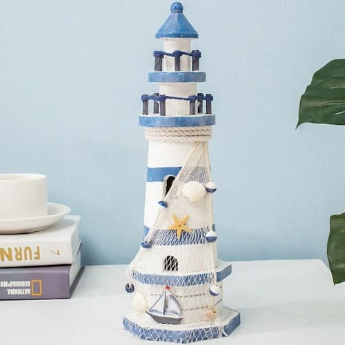 Farol Enfeite Decorativo Náutica Oceano Branco E Azul 30cm