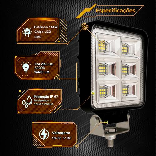 UTILIDADE DO FAROL DE MILHA 48 LEDs 144W.Permite excelente visualização seus percursos e caminhos, devido aos seus 48 LEDs de alto brilho com potência de 144W, Nunca mais passe por sufocos em caminhos perigosos, sem iluminação ou estradas com neblina.INDICADO PARAIndicado para veículos normais, veículos 4x4, caminhões, tratores, ônibus ou até mesmo ambientes residenciais, mas nestes casos deve-se utilizar uma fonte de 12V/24V!FICHA TÉCNICA:COMPOSIÇÃO: Metal Reforçado, Lente de Policarbonato e Carcaça em Alumínio Fundido.PROTEÇÃO IP67: Completamente protegido e a prova de poeira, Não sendo aprova d'água.DICA: “RECOMENDAMOS PASSAR UM SILICONE NOS CONTORNOS DA LENTE PARA ASSIM GARANTIR UMA MELHOR VIDA ÚTIL AO PRODUTO, POIS ELE NÃO É A PROVA DE ÁGUA”.COMPACTIBILIDADE DO PRODUTO: Universal.POTENCIA:POTENCIA TOTAL: 144 W, POR LED: 03W Alta intensidade.TENSÃO:TENSÃO DE FUNCIONAMENTO: 12V E 24V. (ESSE PRODUTO É BIVOLT)LED:QUANTIDADE DE LEDS: 48 LEDS LENTE: Flood / Melhor Abertura.COR E ILUMINAÇÃO:TEMPERATURA DA COR: 6000K.COR EMITIDA PELO FAROL: BRANCO FRIO.FLUXO LUMINOSO: (± 15%): 14.400 lúmens DISTANCIA APRÓX. ILUMINAÇÃO: ± 200~450 metrosPESO:PESO: 650gr (unidade).MEDIDAS:MEDIDAS COM SUPORTE: Altura Aprox.: 13.5cmComprimento Aprox.: 11cm e Largura Aprox.: 3 cm.MEDIDAS SEM SUPORTE: Largura Aprox.: 11 cm Comprimento Aprox.: 10.5cm e Largura Aprox.: 2.5cm.AO REALIZAR A COMPRA VOCÊ IRÁ RECEBER:Itens Inclusos:1 Farol de Milha1 Suporte para fixação2 Parafusos2 Porcas