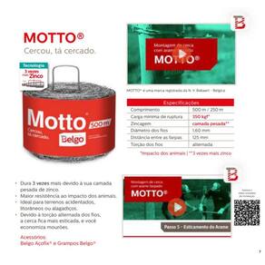 MOTTO é sinônimo de resistência e durabilidade na contenção de animais. Com MOTTO, "Cercou, tá Cercado". Garante sua tranquilidade contra o impacto dos animais e às ações do tempo. Marca: BELGO BEKAERT ARAMES LTDA