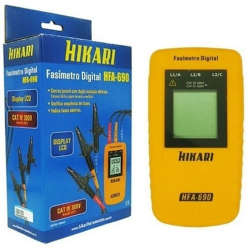 Fasímetro HFA-690 se destaca por detectar o campo rotativo de sistemas trifásicos. O instrumento é destinado a verificar a direção de fase AC em sistemas trifásicos sinalizando o usuário através do visor LCD. O Fasímetro é um indicador de campo rotativo e pode fornecer indicações claras sobre correntes trifásicas e direção da rotação de fases, ideal para determinar ligações corretas. Possui display LCD, facilitando a visualização dos resultados.
