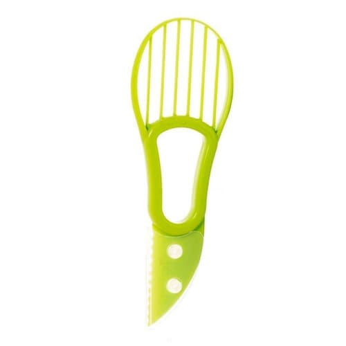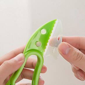 A parte serrilhada frontal pode abrir a casca e a cauda reticulada corta/fatia a polpa;