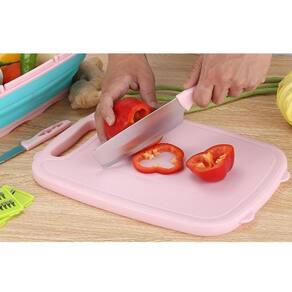 Versatilidade um cortador de cozinha um ralador e cortador de legumes, bem como uma tbua, uma faca de cozinha e um cesto de drenagem.