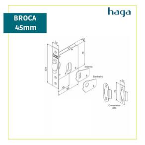 Roseta: R529 em aço inox Cilindro: 131 Broca: 45 mm Contra Testa: Ref. 603 – 2 furos Testa e Contra Testa: Com cantos retos, fabricadas conforme o acabamento Uso indicado: Portas externas de bater