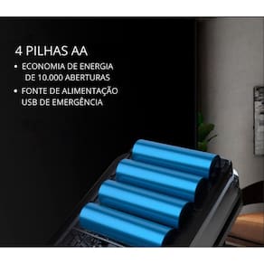 Material: Zamak / Aço Tipo instalação: Embutida Espessura de porta: 35 a 50mm Broca padrão: 60 a 70mm Regulagem para encaixe do miolo Alimentação: 4 pilhas AA Não acompanha o produto