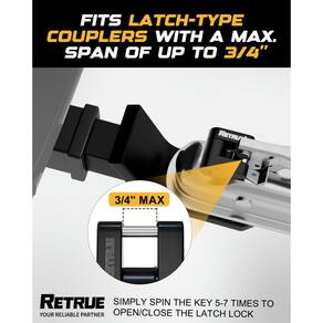 - Força confiável. Esta trava de reboque é feita de liga de zinco de alta resistência e protegida dos elementos com seu acabamento pintado de preto, enquanto o pino do acoplador é blindado contra corrosão com um revestimento de zinco durável, aumentando a vida útil da trava do acoplador e a segurança