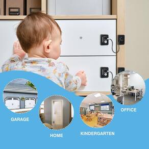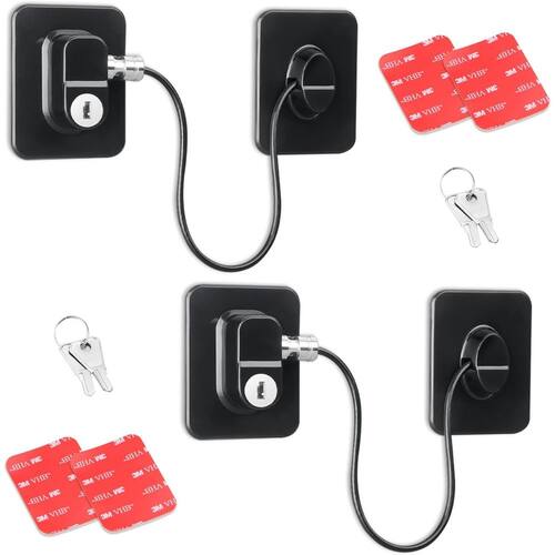 Especificação Material: Liga Cor: Preto Peso: 130 g Tamanho do produto: 6x4,6 cm Lista de embalagem: 2 x fechadura Design de alta segurança: apresenta um sistema confiável de bloqueio com chave para impedir eficazmente o acesso de crianças ou não autorizado a geladeiras e armários. Instalação adesiva forte: equipada com almofadas adesivas 3M VHB premium para uma instalação rápida e sem ferramentas que permanecem firmes no lugar. Cabo durável e anti-corte: o núcleo de fio de aço inoxidável coberto com revestimento de PVC oferece alta resistência e resiste a cortes ou puxões. Compatibilidade universal: funciona em vários eletrodomésticos e móveis, incluindo geladeiras, gavetas, armários, janelas e muito mais. Sistema de chaves conveniente: vem com chaves universais compatíveis com travas do mesmo modelo para facilitar o uso e o acesso de backup.