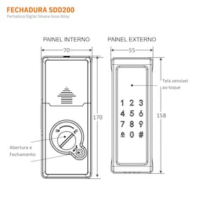 A SDD 200 é uma fechadura digital com abertura por senha, possui teclado touchscreen e possui alimentação de emerggência com uma bateria de 9V. A SDD200 possui alarme de pilha fraca e alarme de arrombamento caso a fechadura seja aberta de forma indevida.