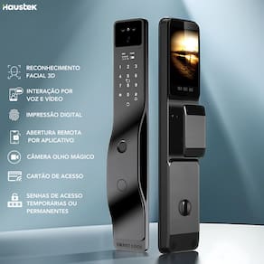 Funcionamento: Para abrir basta olhar para a câmera da fechadura, usar o celular, colocar a digital, digitar a senha, aproximar o cartão RFID ou usar a chave mecânica. Possui trava interna para maior privacidade, impedindo abertura pelo lado de fora. Veja pelo celular quem tocou a campainha e decida abrir ou não.
