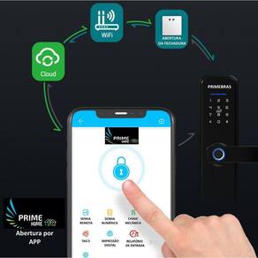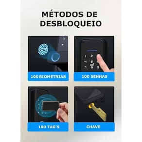 Funcionamento: quando a porta fechar basta acionar a maçaneta externa para cima que a tranca é acionada. Para abrir basta colocar a digital ou digitar a sua senha ou aproximar o cartão de proximidade ou usar a chave mecânica. Pode ser aberta remotamente via WIFI. Possui trava interna para maior privacidade impedindo a abertura por fora.