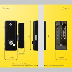 Fechadura Digital Reflecta de Sobrepor - Abertura por Senha e Biometria A Fechadura Digital Reflecta Yale oferece segurança moderna com abertura por senha, biometria e cartão, acabamento espelhado e resistência IP55. Uma solução prática, elegante e confiável para qualquer ambiente. Espessura da Porta: 30 a 80mm Tipos de portas: Madeira e metal Acabamento: Espelhado Tipos de abertura: Senha numérica, biometria e cartão Números de usuários: 30 senhas, 30 biometrias e 30 cartões Acionamento de Emergência: Cabo USB-C Tipos de travamento: Manual ou automático sensorizado Guia de voz: Voz Garantia: 2 anos de garantia de fábrica Marca: Yale Alarmes: Violação e intrusão IP: IP55 - Lado externo resistente à chuva e a sol Salt Spray: 144 horas Material: liga de zinco, liga de alumínio, plástico ABS e acrílico PC Frequência da Tag: 13,56 MHZ Dimensão da face externa (mm): 67x166x15 Dimensão da face interna (mm): 74x175x36 Dimensões da Caixa (mm): 230x250,8x80,5 Peso: 1,024 kg