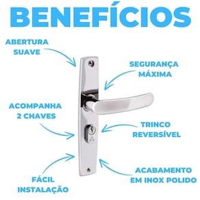 DIFERENCIAIS - Design Moderno: Acabamento em aço inox polido cromado para um toque sofisticado. - Alta Durabilidade: Resistente à corrosão e desgastes em condições climáticas adversas. - Compatibilidade Universal: Adapta-se facilmente a diferentes estilos de portas externas.