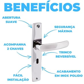 DIFERENCIAIS - Design Moderno: Acabamento em aço inox polido cromado para um toque sofisticado. - Alta Durabilidade: Resistente à corrosão e desgastes em condições climáticas adversas. - Compatibilidade Universal: Adapta-se facilmente a diferentes estilos de portas externas.