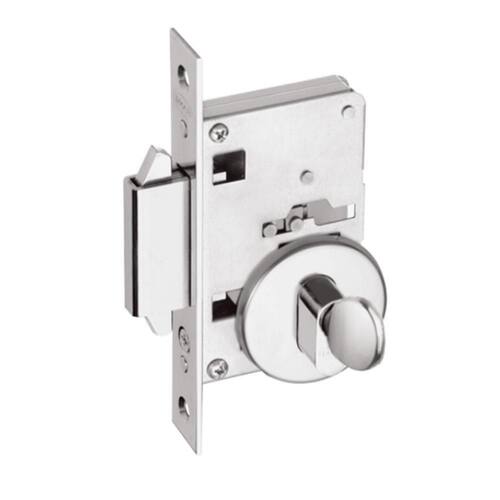 fechadura lingueta expansiva banheiro tipo bico de papagaio, com dupla trava e lingueta conjugada, para portas de correr e de bater, com espessura de 25 a 35 mm e broca de 40 mm. Com caixa de profundidade de 59 mm mais estreita e caixa da fechadura blindada zincada, propicia maior proteção contra corrosão, poeira, e resíduos de madeira. A chapa testa e a contratesta são produzidas em aço inox, enquanto a lingueta e o mecanismo da trava são em aço estampado super-reforçado, com acabamento cromado, além do mecanismo interno é feito com proteção zincada contra corrosão.O acionamento com tranqueta é do tipo botão, em zamak, com utilização de chave de emergência.