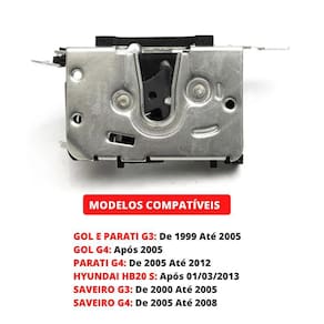 Fechadura porta dianteira esq gol g3 99 até 05 g4 após 05 Conteúdo da embalagem ------------------------------------------------- - fechadura da porta dianteira esquerda mecânica predisposta para elétrica - valeo Veículos aplicáveis Volkswagen--------------- Gol e parati g3: de 1999 até 2005gol g4: após 2005parati g4: de 2005 até 2012saveiro g3: de 2000 até 2005saveiro g4: de 2005 até 2008 Identificação do produto --------------------------------- Marca: universal Código universal do produto ean : 7895272216012 Código ipi: 87082999 Código ncm: 8871 Sku universal: 21601volkswagem