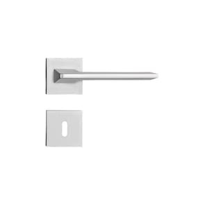 Guarnição: 4 Rosetas em Zamac (fixadas por pressão em almas plásticas fixadas na porta por parafusos auto-atarrachantes de cabeça fenda philps em latão)