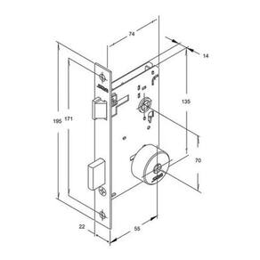 Distância de broca: 55 mm; Distância de eixo: 70 mm; Largura: 74 mm