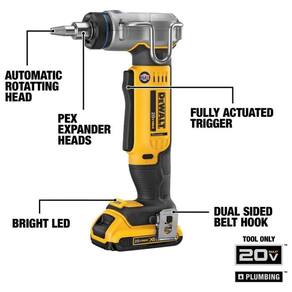 Expande a tubulação Pex Type A de Possui uma ação de cabeça rotativa automática para expansão uniforme A ferramenta de expansão pex vem com acionamento completo do gatilho para uso em espaços apertados Luz de trabalho LED brilhante para ajudar a iluminar áreas escuras Ganchos de cinto e ganchos de dupla face para zenamento conveniente Sobremoldagem de borracha para aderência confortável e ergonômica ATENÇÃO BATERIA 20V MAX E CARREGADOR NÃO INCLUSOS Marca: Não Informado