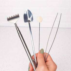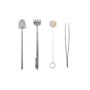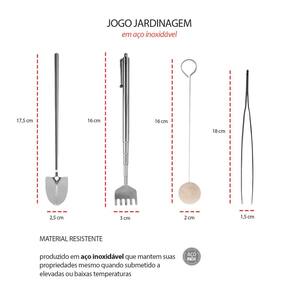 Jogo de mini ferramentas para jardinagem peças produzidas em aço inoxidavel. As ferramentas pequenas sao perfeitas para jardinagem de casa ou apartamento e manejo de plantas de pequeno porte, como cactos, bonsai e suculentas. Cada peça possui funçao propria, sendo o ancinho, ajustavel ate 41cm, e perfeito para nivelar e mover substrato em espacos dificeis de alcancar. A pinça facilita a remoçao de detritos e o ajuste de plantas em cantos estreitos, garantindo um manuseio preciso. A pa excelente para compactar o solo e adicionar camadas de musgo e areia. Ja o espanador e ideal para limpar poeira e sujeira em folhas frageis ou no vidro do terrario. Contem: 1 Pinça Medidas: 18 x 1,5 cm 1 Pá Medidas: 17,5 x 2,5 cm 1 Espanador Medidas: 16 x 2 cm 1 Ancinho Medidas: 16 x 3 cm Material: Aço Inox