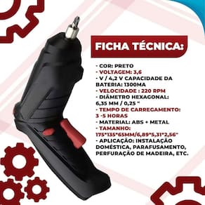 Especificações Voltagem: 3,6 v a 4,8 v dc Velocidade: até 250 rpm Torque máximo: 3,5 nm Rotação: bidirecional Bateria: 1500 mah recarregável Tempo de carga: 2 horas Autonomia aproximada: 1 hora Material: abs e borracha Tamanho da parafusadeira: 12 cm x 11,5 cm Tamanho da maleta: 24 cm x 18,5 cm x 6 cm Peso total: 876 g Marca: Não Informado Ean: 7905577116983