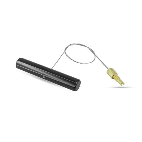 Esta ferramenta de puxar o bico da câmara de ar, possui um cabo de aço resistente ligado a uma base para segurar, na ponta do cabo de aço há uma rosca que se encaixa perfeitamente na parte interna da válvula de ar e permite que você puxe com facilidade.