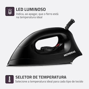 O Ferro a Seco Mondial FSN-55-B é prático e fácil de usar. Possui design anatômico confortável para passar e base de alumínio polido que desliza suavemente sobre os tecidos, distribuindo o calor de forma uniforme e rápida. Conta com sistema Salva Botões, para maior durabilidade e precisão na hora de passar, sem estragar suas roupas, além de seletor de temperatura e lâmpada piloto. Saiba mais sobre o FSN-55-B da Mondial: DESIGN ANATÔMICO: O ferro de passar da Mondial tem design moderno e confortável para passar suas roupas com mais facilidade.