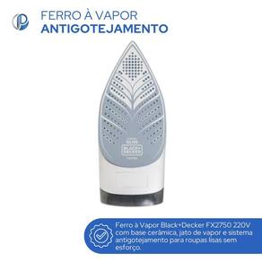Marca: Black+Decker Modelo: FX2750-B2 Tipo: Ferro a vapor doméstico Voltagem: 220V Potência: 2000W Reservatório de água: 340 ml Base: Ceramic Gliss cerâmica antiaderente Vapor contínuo: até 24 g/min Jato de vapor extra: Sim Função vapor vertical: Sim Spray frontal: Sim Controle de temperatura: Sim, com guia de tecidos Sistema antigotejamento: Sim Função autolimpeza: Sim Cabo: Giratório 360