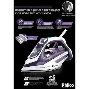 Conheça o ferro de Passar Roupa a Vapor e a Seco da Philco, disponível nesta versão nas cores Roxo e Branco. Sua base é feita com tecnologia Nano Cerâmic com acabamento aprimorado, que dá o efeito deslizante. A função anticalcário evita a obstrução nas saídas de vapor e resulta na durabilidade e performance, já o anti-gotejamento evita aquela indesejável gotas de água na roupa mesmo em temperaturas mais baixas. Conta com 450ml de capacidade do reservatório de água, desliga automaticamente se mantido 30 segundos na horizontal sem uso. Também desliga automaticamente sem mantido 8 minutos na vertical sem uso. Além de contar com um deslizamento perfeito para roupas mais lisas e sem amassados.