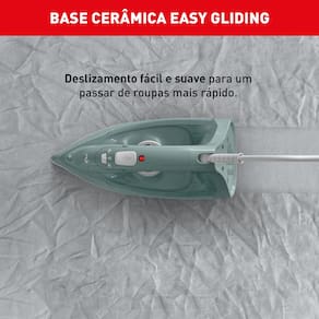 A Base de Cerâmica Easy Gliding garante deslizamento suave e proteção para os tecidos, enquanto o Vapor Contínuo de 25g/min e o Vapor Extra de 110g/min eliminam até os vincos mais difíceis.