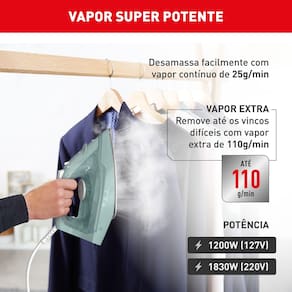 Com Ponta de Precisão, Vapor Vertical e Borda Salva-Botões, você alcança áreas difíceis e protege os detalhes das peças. Tudo isso com aquecimento rápido em até 30 segundos e potência de 1200W.