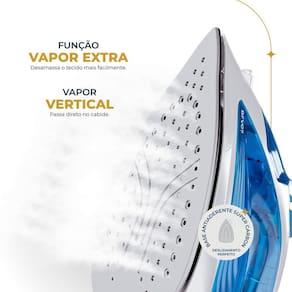 A função vapor vertical possibilita desamassar roupas diretamente no cabide, ideal para peças delicadas ou de última hora. Já a função vapor extra elimina amassados e vincos difíceis de forma rápida, otimizando seu tempo.