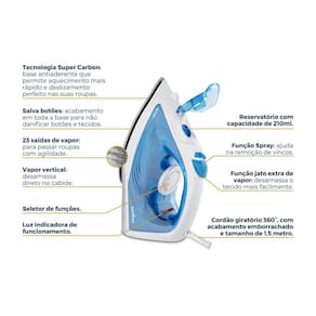 Já as 23 saídas de vapor, possibilitam passar suas roupas com mais agilidade e eficiência. Experimente o Ferro de Passar a Vapor Britânia BFV07 e aproveite a combinação perfeita de tecnologia e praticidade no seu dia a dia.