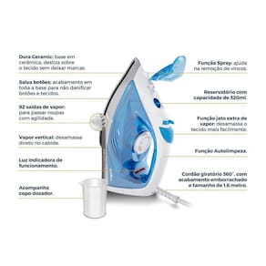 Com um reservatório generoso de 320ml, você tem autonomia ampliada e pode monitorar o nível de água em tempo real, garantindo sessões de passar mais longas e eficientes. O Ferro também possui função Vapor Vertical, que permite desamassar suas roupas diretamente no cabide, com fortes jatos de vapor que restauram a aparência impecável sem esforço.