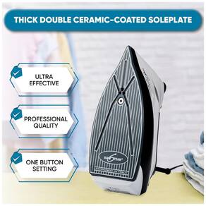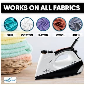 REMOVEDOR DE RUGAS ULTRA EFICAZ. De tecidos delicados como seda e lã a tecidos mais pesados como linho, este ferro EuroSteam Next Generation faz maravilhas em todos eles. Mantenha suas roupas com aparência profissional, enquanto economiza tempo e dinheiro. SISTEMA DE CALDEIRA EMBUTIDO. Aquece a base e a água, proporcionando um calor consistente em todo o ferro. Não há risco de queimar ou queimar os tecidos da roupa. Este ferro de uma temperatura faz tudo com uma única prensa sem configurações para ajustar. REDUZA O TEMPO DE PASSAGEM. Deslize sem igual por diferentes roupas e áreas de difícil acesso. Sua ponta pontiaguda facilita a compressão de rugas teimosas e o ferro entre as presilhas e os botões do cinto. VERSÁTIL. Cozinhe o vapor horizontalmente em uma tábua de passar ou verticalmente para pendurar roupas e cortinas. Sua base dupla espessa revestida de cerâmica, semelhante às utilizadas em ferros de ondulação de alta qualidade, oferece resistência a arranhões e durabilidade incomparável