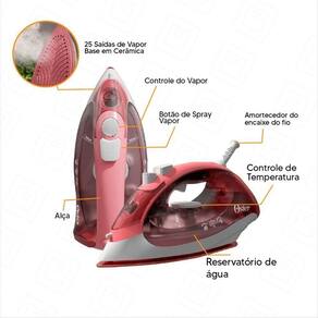 Ele contém 1400W de potência e funciona em tensão de 220V. Ele tem um design moderno e compacto nas cores branco e rosa e um cabo de energia com 1,8m de comprimento.