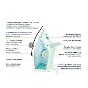 Possui 23 saídas de vapor que proporcionam um jato contínuo e potente, além da função vapor extra e spray, que auxiliam na remoção de vincos profundos com precisão e rapidez.