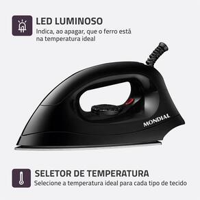 O Ferro a Seco Mondial FSN-55 é prático e fácil de usar. Possui design anatômico confortável para passar e base de alumínio polido que desliza suavemente sobre os tecidos, distribuindo o calor de forma uniforme e rápida. Conta com sistema Salva Botões, para maior durabilidade e precisão na hora de passar, sem estragar suas roupas, além de seletor de temperatura e lâmpada piloto.