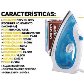 Conteúdo da Embalagem: - 1 Ferro de Passar Agratto - 1 Copo Medidor - Manual de Instruções - Garantia: 12 meses