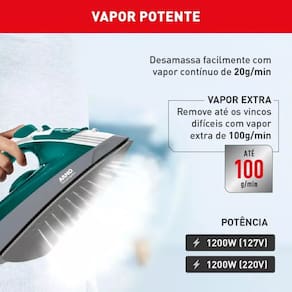 Com 1200W de potência, 27 saídas de vapor e base antiaderente 25% maior, garante melhor deslizamento e resultados rápidos.