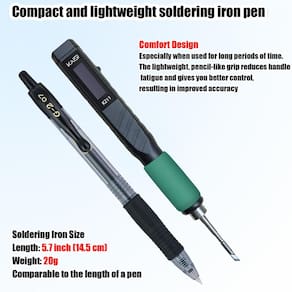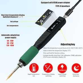 Ferro de solda Kaisi K211: este ferro de solda a lápis (sem fio) Tipo: tipo de lápis. Características do produto: aquecimento rápido, controle de temperatura constante, exibição de temperatura da tela, calibração de temperatura, comutação de tela L/R, suspensão automática, design ergonômico e leve. Temperatura de saída: 100-450°C (100.0-450.0 °C) Número do modelo: K211 Fonte de alimentação: Tipo-C Potência máxima PD: 65W Manutenção ? Quando uma nova ponta de ferro de solda é usada pela primeira vez, ela precisa ser aquecida a 350 °C e estanhada para evitar a oxidação de queima a seco. ? Depois de usar o ferro de solda, aplique uma quantidade apropriada de solda na ponta do ferro de solda para evitar oxidação. ? A temperatura normal de funcionamento da ponta do ferro de solda é de cerca de 300-380 °C, não use por um longo tempo se a temperatura for muito alta para afetar sua vida útil. Evite bater violentamente na cabeça do ferro de solda durante a soldagem. ? Não use esponja molhada com água limpa, o estado semi-seco é melhor. ? Não use pó de escamação com alto teor de cloro ou ácido para evitar corrosão na superfície. ? Se a superfície da ponta do ferro de solda estiver oxidada e não grudar no estanho, use gaze ou outras ferramentas para limpar cuidadosamente a camada superficial, depois aqueça-a até 250 °C, aplique imediatamente o estanho para colar a superfície para evitar a reoxidação. Instruções de segurança ? A temperatura da ponta do ferro de solda pode chegar a 100-450°C. Não toque na ponta do ferro de solda. Mantenha fora do alcance das crianças. ? Não molhe este produto ou use em um ambiente úmido. ? Quando não estiver em uso por um longo tempo, desconecte a energia. - Kaisi Ferro de solda K211: este ferro de solda de lápis (sem fio) está equipado com 3 peças C210 (C210-I, C210-IS, C210-K) cabeça de soldagem de aquecimento rápido e adaptador de energia de 65 W, com temperatura ajustável (100.0 °C-450.0 °C/100-450 ?), mudança de temperatura, calibração de temperatura, sono automático e mudança de direção da tela - Aquecimento rápido e design leve: o ferro de solda portátil pode realizar o aquecimento rápido da solda. A temperatura pode ser ajustada na faixa de 100 a 450 °C e pode ser precisa a cada -17 °C. Ao mesmo tempo, ajustará automaticamente a potência de saída de acordo com a fonte de alimentação que você usa. O design compacto e o design leve não farão você se sentir cansado mesmo se você trabalhar por um longo tempo, o que é mais adequado para solda de precisão - Suspensão automática inteligente: após ligar, a caneta de ferro de solda permanecerá por 30 segundos e depois entrará no modo de suspensão (predefinida). Quando você pegar novamente, ele reiniciará automaticamente o aquecimento para a temperatura que você definiu. Pressione e segure a tecla de ajuste para entrar no modo de hibernação, que você pode definir para 10~60S de acordo com o hábito de uso - Calibração de temperatura: para solda de precisão, o controle preciso da temperatura pode atender melhor aos requisitos. Este ferro de solda USB C tem dois modos de calibração de temperatura, CAL/TEMP, para calibração, que é conveniente para ajustar de acordo com as necessidades e melhorar a precisão da solda - Ampla aplicação: mini ferro de solda amplamente utilizado para placa de circuito de soldagem, reparo de eletrodomésticos, fabricação de joias e toucas de metal, computador e bricolage. Perfeito para iniciantes, soldadores, equipamentos domésticos básicos, treinamento de engenheiro de soldagem, etc