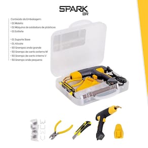 Conteúdo da Embalagem: - 01 Maleta; - 01 Máquina de soldadura de plásticos; - 01 Estilete; - 01 Suporte Base; - 01 Alicate; - 50 Grampos onda grande; - 50 Grampo de canto externo M; - 50 Grampo de canto interno V; - 50 Grampo onda pequena.