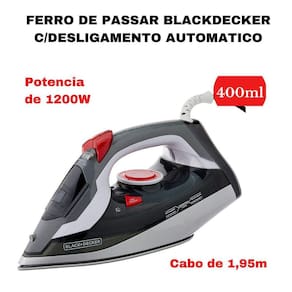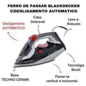 Descrição:Com o ferro a vapor FX3900 Superb Steam da BLACK+DECKER, você passa suas roupas com muita praticidade Além das funções básicas e de seu design elegante e moderno, ele conta com o desligamento automático, que desativa o ferro após 8 minutos sem uso na vertical ou 30 segundos na horizontal . Basta movimentá-lo que ele liga novamente Sua eficiência e a base TECHNO CERAMIC reduzem o tempo e esforço de passar as roupas. Ele passou antigotejamento, que evita que o ferro vaze água pela base quando está frio, e filtro interno ante calcário, que evita o entupimento das saídas de vapor. Precisa desamassar rapidamente Utilize o vapor vertical diretamente no cabide. Também conta com a função autolimpeza, que garante a performance do vapor ao longo do tempo. Com a BLACK+DECKER, cuidar de suas roupas fica fácilCaracterísticas:-ferro de passar a vapor Superb Steam com spray extra e vapor vertical;-base cerâmica Techno Ceramic;-ajuste de vapor;-autolimpeza e tanque destacável;-cabo giratório 360, seletor de tecidos e luz piloto;-potência: 1.200W 127V e 1.800W 220V Ficha Técnica-capacidade400 m-material do recipiente / jarra / copo / coletor Resina plástica, alumínio e fio de cobre-comprimento do cabo elétrico m 1.65-potência2000 Watts 220V / 1200 Watts 127V -frequência60 Hz-garantia1 ano-consumo de energia 0.109 kw/h 220V / 0.118 kw/h 127V -temperatura180c até 200C-quantidade de vapor22.8 g/min 220V / 19.6g/min 127V Não deixe de garantir esta peça da Magazine Geraisque iráteproporcionar muita praticidade e modernidade