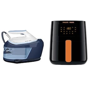 Conjunto contendo Ferro de Passar PerfectCare Série 6000 com tecnologia OptimalTemp e Airfryer Conectada Série 5000 com capacidade de 4,1L, controle via app HomeID e Alexa, 7 predefinições, timer de 60 minutos e até 90% menos gordura.Cesto removível