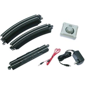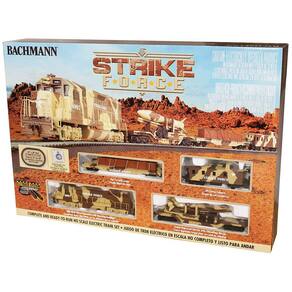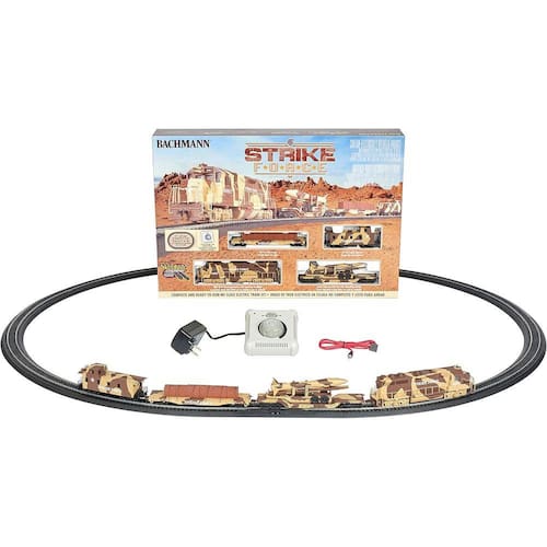 Locomotiva a diesel EMD GP40 com farol operacional carro plano com caixas carro plano deprimido no centro com míssil de camuflagem vagão de cúpula compensada engates EZ Mate® montados no corpo 47" x 38" oval de encaixe E-Z Track®, incluindo 12 pedaços de trilho curvo, 1 pedaço de trilho reto e 1 recarrilador de terminal plug-in pacote de energia e controlador de velocidade