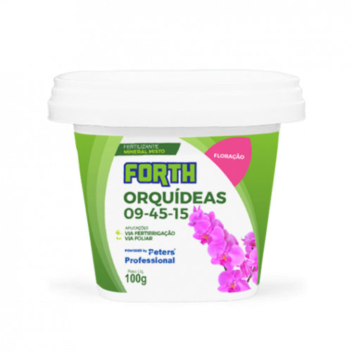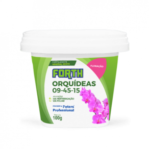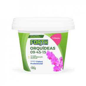 FORTH Orquídeas Floração 09-45-15 Forth Orquídeas Floração NPK 09-45-15 - para a fase de floração das orquídeas.adubo específico para a planta que está na fase de crescimento.O alto teor de Potássio favorece a floração mais acelerada da Orquídea. FORTH ORQUÍDEAS Floração fornece uma nutrição balanceada para favorecer a floração das orquídeas, quando começam a emitir os primeiros pêndulos de flores até a queda da flor. Fertilizante Forth Orquídeas Floração, estimula a floração de orquídeas, especialmente quando estiverem na época de floração.Sua formulação contribui para o crescimento, manutenção e floração mais saudáveis da planta, resultante em flores mais bonitas.A aplicação é via foliar e fertirrigação, pois todos os nutrientes são solúveis em água. -Floradas mais abundantes;-Fortalecimento da orquídea na florada;-Cores mais vivas para flores e folhas; DOSAGEM colher de café = 2g Aplicação via foliar1 colher em 1L de águaSemanalPulverizar a parte de cima e de baixo das folhas.