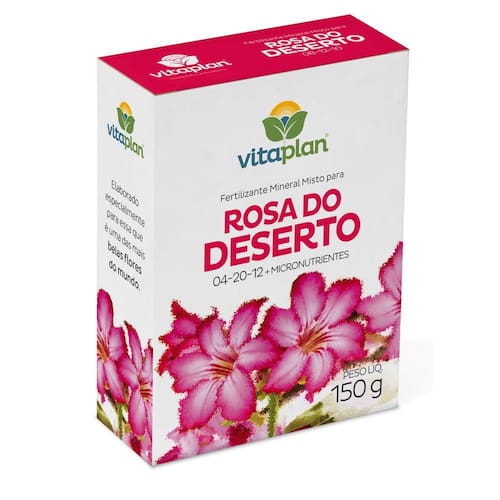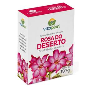 Fertilizante Mineral Misto Rosa Do Deserto Vitaplan 150g Fórmula ideal para o ótimo desenvolvimento de sua rosa do deserto.Fortalecendo o enraizamento e floração, bom desenvolvimento das folhas e maior tolerância a intempéries e cores mais vivas e expressivas. Pode ser utilizado em outros tipos de plantas.