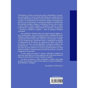 Corpos Erópticos e Metrópole Comunicacional (revisto e atualizado) O fetichismo é o único conceito que reúne o colonialismo, o marxismo, a psicanálise e o senso comum. Há muitos anos, minha obsessão é tentar transformar as clássicas teorias de Marx e Freud sobre esse conceito. As manifestações do fetichismo mudam constantemente devido à sua incorporação à comunicação digital ou à proliferação de entidades analógico-digitais; as distinções clássicas entre corpos e coisas, objeto e sujeito, orgânico e inorgânico, natureza e cultura se dissolvem e emergem entrelaçamentos constantes e inesperados – sincréticos, polifônicos, ubíquos – além de qualquer dualismo conceitual. Para enfrentar o desafio, nesta nova edição repensei alguns autores fundamentais, entre eles, Edward Said e Siegfried Kracauer. Também suprimi capítulos e simplifiquei trechos a fim de tornar o propósito do livro mais claro: remover as incrustações “científicas” que classificavam o fetichismo desde o colonialismo português ao Iluminismo de De Brosse, da reificação de Marx à perversão em Freud e ao senso comum difundido. A proposta é afirmar um metafetichismo – ou seja, um fetichismo para além de si mesmo – por meio do qual enfrentar os excessos transformadores do atual contexto político-comunicacional, para libertar pessoas e coisas da obrigação de serem úteis. Se tudo muda em tempos e espaços acelerados, também um texto que tente lidar com essas mutações não pode ficar imóvel. E então, este livro decide se tornar mutante e mutável. Um alerta na leitura: o olhar etnográfico é ubíquo. Sua pupila se move nas conexões confusas entre espaços e tempos simultâneos, diversificados e contíguos. [Massimo Canevacci]