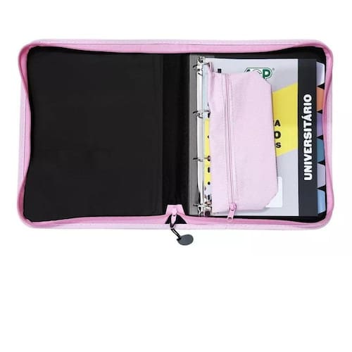 Organize seus estudos com praticidade e estilo utilizando o Fichário Universitário 4 Argolas Pastel Com Estojo Acp Rosa!
