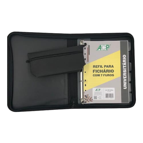 Fichário Universitário Acp 4 Argolas Trade Mark 942 Preto O Fichário Universitário Académie é um produto prático que possui fechamento em zíper, com folhas 96 folhas pautadas, estojo e 6 divisórias transparentes. - Marca: ACP- Referência: 942- Cor: Preto- 4 Argolas- 1 estojo- 6 divisórias transparentes- 96 folhas pautadas 20x27,5cm - Tamanho do fichário: 270mmx345mmx45mm- Tamanho do estojo: 235x120x55mm- Composição do fichário: Pvc, Nylon, Poliéster, Papelão, PP, Metal, Zíper e Cursor- Composição do estojo: Pvc, Ziper e Cursor